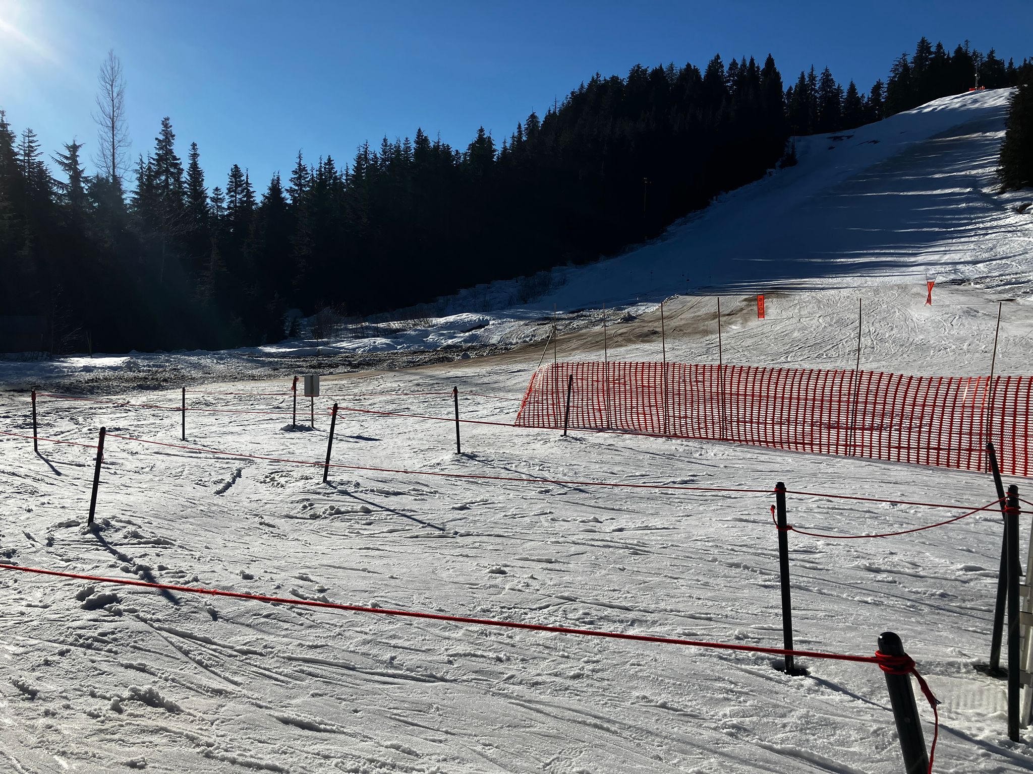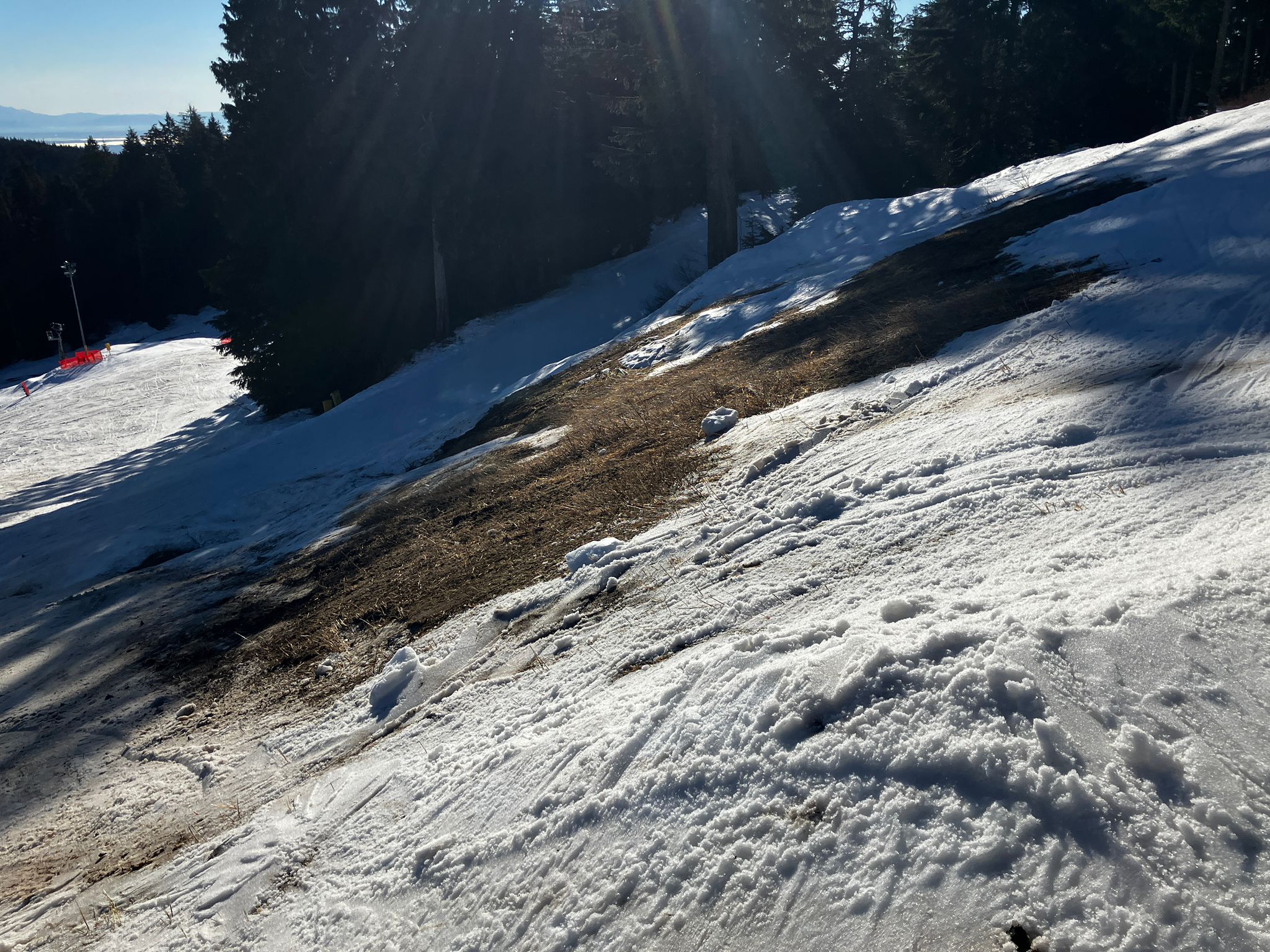 It remains very hot. The second straight day of inversion conditions, where the temperature at 1000m ASL is higher than at sea level. What a travesty. Again the chairlift ramp required frequent shovelling. So much snow had melted from the ground level that there was a major hill to climb up to the loading ramp of the chairlift.